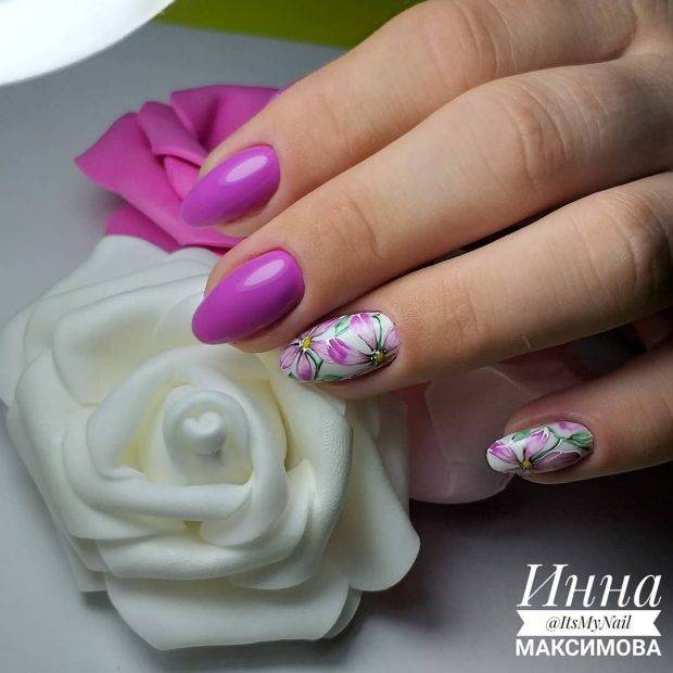 Цветы – самый распространенный вариант ногтевого дизайна в акварельной технике. Для того чтобы флористическое изображение имело более аккуратный и красивый вид, стоит отдать должное готовым картинкам. Это даст уникальную возможность следить за правильностью нанесения конкретных орнаментов и красочных оттенков. Акварельные краски предоставляют уникальный шанс получать необходимые цветовые гаммы при помощи смешивания и разбавления красок. Таким образом, нужный цветочный рисунок не требует многослойных нанесений. Всего лишь необходимо правильно подойти к оттенкам и как можно тщательней их наносить.