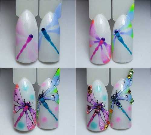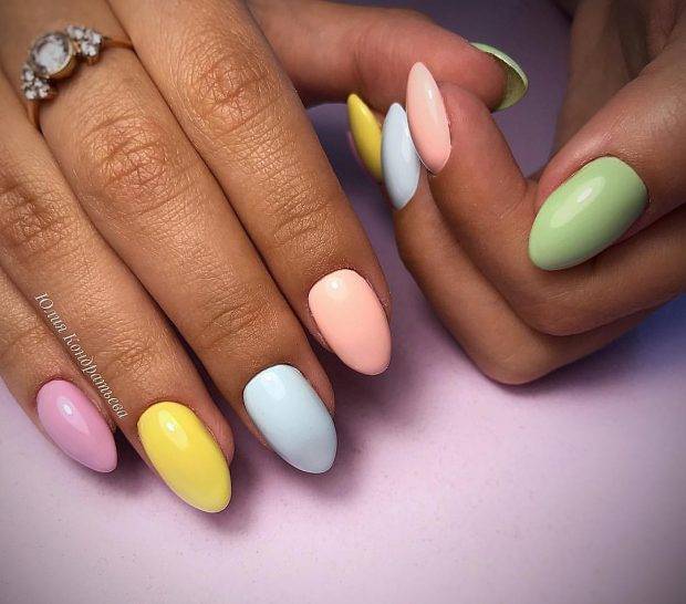 Дизайн этого вида маникюра допускает использовать от двух до пяти цветов – большее количество на ногтевой пластине не поместится, да сложно обеспечить плавность перехода оттенков.