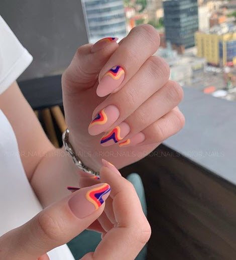 Замечательно дополнят персиковый маникюр изящные завитки, кружевные фрагменты, вензеля. Никогда не подведет геометрия – разноцветные орнаменты всегда в теме.