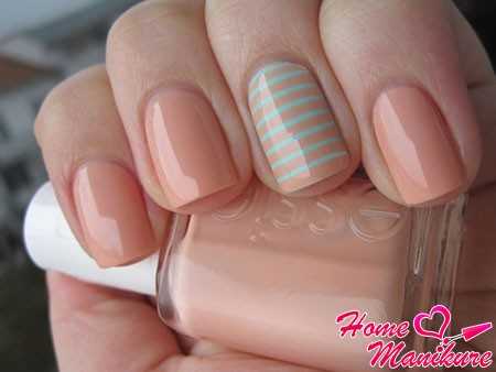 Тот факт, что на светлых гелях отлично видны царапины, сколы – не секрет. Отлично выделяются и неровные места на ногтевой пластине, поэтому следует тщательно обрабатывать ноготки перед маникюром. Персиковый дизайн ногтей, как на фото, должен выполняться с особой аккуратностью, чтобы после нанесения полос не было заметно. Поэтому специалисты рекомендуют «распределять» покрытие тремя штрихами. Светлый тон необходимо наносить в три слоя, чтобы цвет стал достаточно насыщенным.