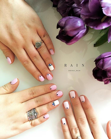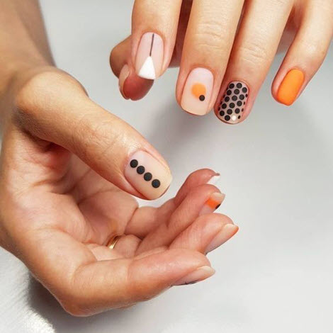 Можно создать персиковый дизайн ногтей, как на фото ниже, с выделением безымянного пальца. На нем вертикально в два ряда расположить точки черного и белого цветов в порядке уменьшения.