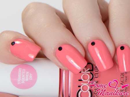 Монохромный персиковый маникюр можно украсить стразами, выложив на акцентных пальчиках несложный орнамент. Хороша будет металлизированная скотч-лента – тонкие линии лишь подчеркнут изящество образа.
