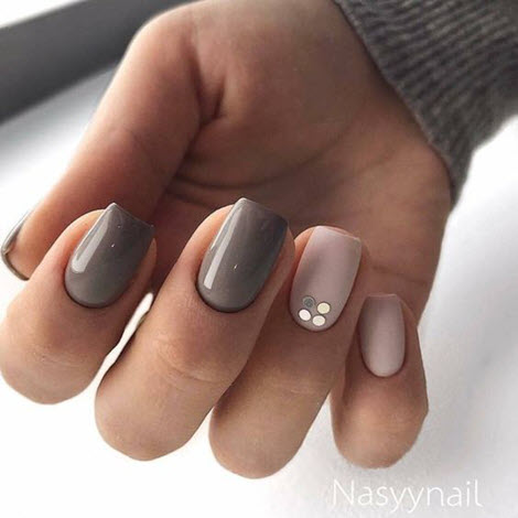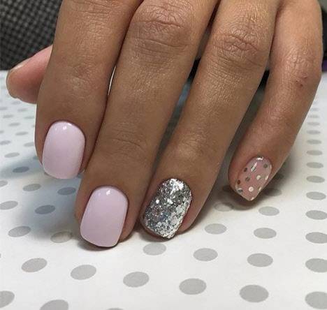 Серый маникюр очень часто дополняют дизайном с блестками одного или двух пальчиков. Такой маникюр подходит как для повседневного образа, так и для праздничного выхода в свет.