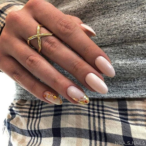 - С золотым. Персиковый лак прекрасно дополнит золото. Можно использовать со стразами, втирками, блестками для роскошных вечерних образов.