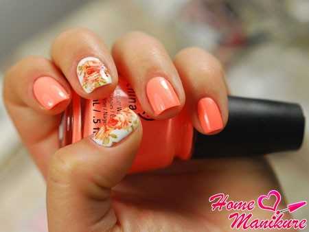 Хорош будет персиковый и в лунном маникюре. Здесь тоже можно экспериментировать, используя его либо как основной цвет, либо как акцент для прикорневой лунки.
