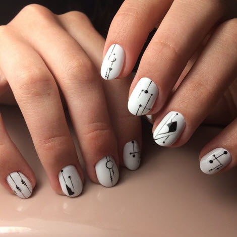 Хороший вариант — воспользоваться дотсом для выполнения рисунка «горох» черным цветом на покрытии нежного оттенка. С его помощью можно осуществить нанесение различных узоров, завитушек, создать геометрические рисунки.