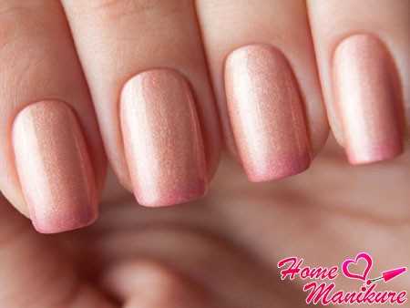 Еще один прекрасный вариант – втирка. Особый порошковый пигмент полностью изменит внешний вид вашего маникюра. Вы можете выбрать втирку персикового цвета и нанести ее на все пальчики – получится эффект полированного металлического покрытия, но в необычном прекрасном цвете.