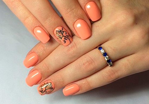 Монохромный персиковый маникюр можно украсить стразами, выложив на акцентных пальчиках несложный орнамент. Хороша будет металлизированная скотч-лента – тонкие линии лишь подчеркнут изящество образа.