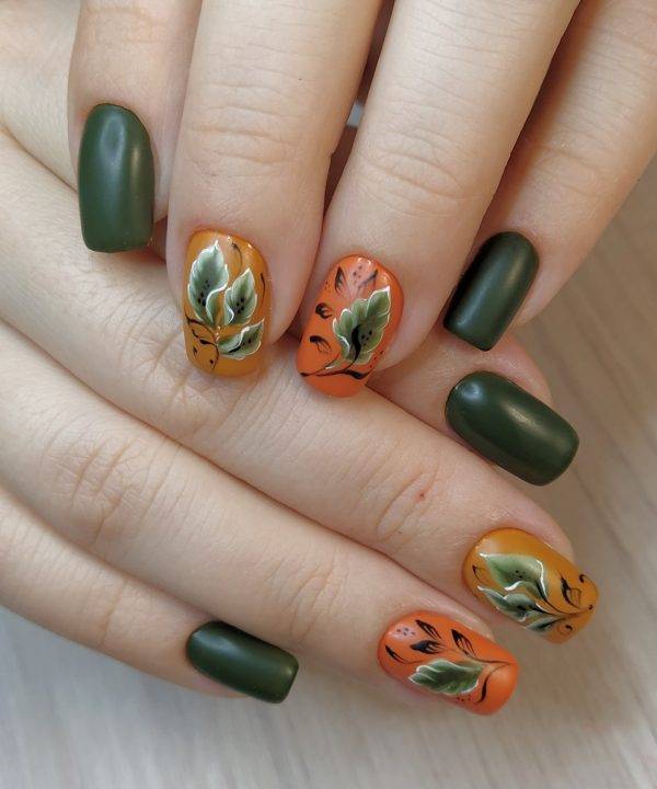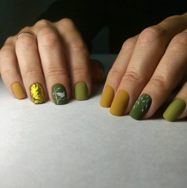 Великолепно смотрится на ноготках сочетание оливкового и горчичного оттенков. Не уступает в привлекательности и сине-желтый тандем. Только помните, что цвета для создания этого дуэта нужно выбирать глубокие, насыщенные, чтобы они ассоциировались с осенью. Очень символично будет смотреться нейл-арт в оранжевом и темно-зеленом цвете. Он словно отразит красивое увядание листьев.
