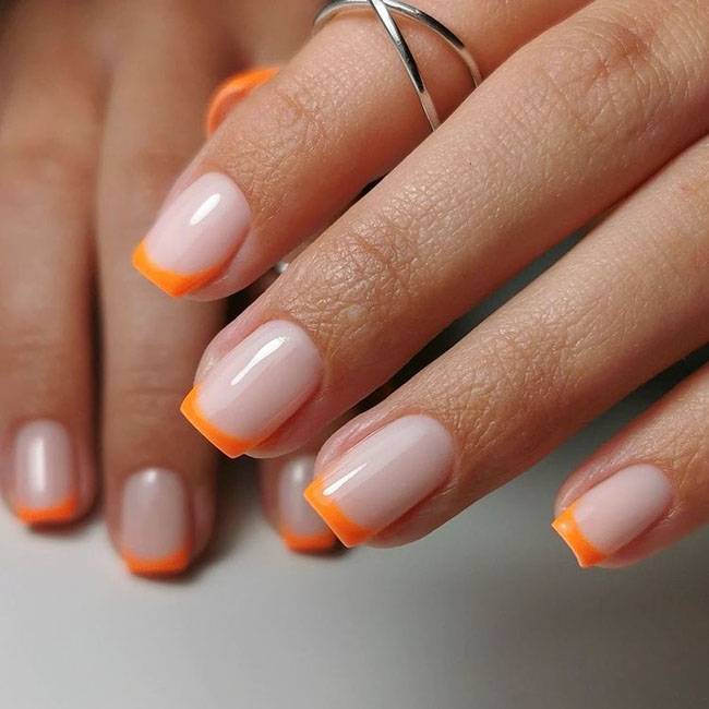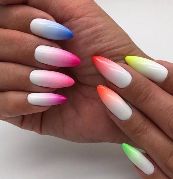 Перед вами модный маникюр омбре, где за основу взят нежный белый, а верхняя часть ноготков оформлена в цветной растяжке оранжевого, малинового, морского, кораллового, желтого.