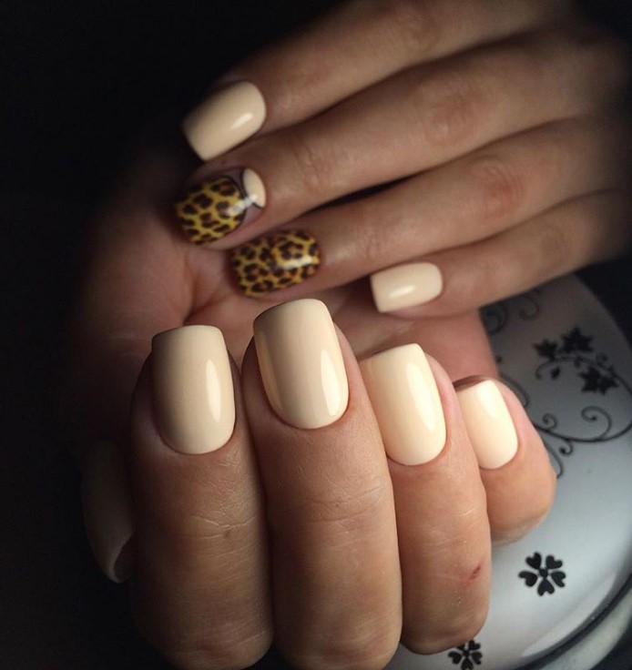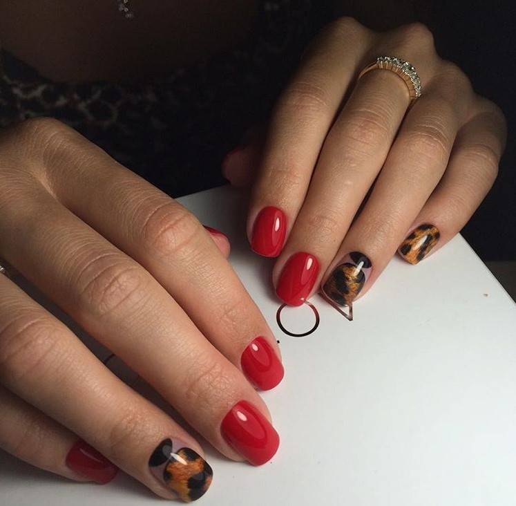 Пятна могут быть спокойными бежевыми или же выделяться ярким красным цветом. Каждая модница решает сама, в каком цвете она хочет создать маникюр с леопардовым принтом.