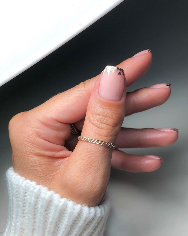 По-прежнему в моде лунный дизайн со стразами, разграничивающими лунку и ногтевую пластину. Модный зимний маникюр использует серебристый и золотистый гель лак, комбинацию в одном образе классического и обратного френча.