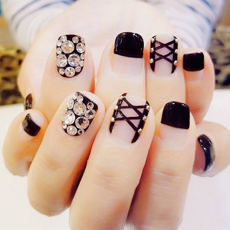 Стразы – вариант дизайна на случаи ярких вечеринок. Маникюр со стразами – не самое практичное решение, но очень эффектное. При создании модного дизайна стразы лучше располагать в основании ногтя, при этом создавая определенный рисунок, форму полукруга либо треугольника.