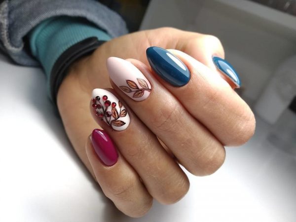 Советуем прибегнуть и к более сложным сочетаниям из трех оттенков. Например, очень эффектно будет выглядеть маникюр в синей, белой и бордовой гамме. Причем каждый цвет должен быть «холодным», чтобы точно соответствовать времени года. Синий и белый используйте как основу, а бордовым можно прорисовать те же листья или грозди рябины.