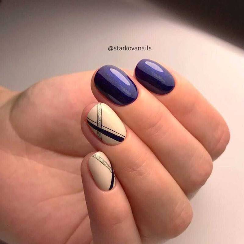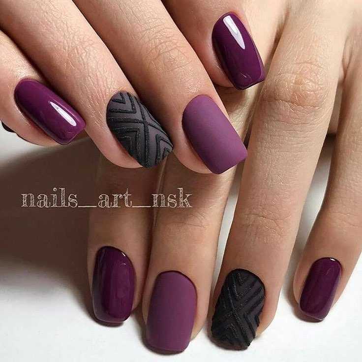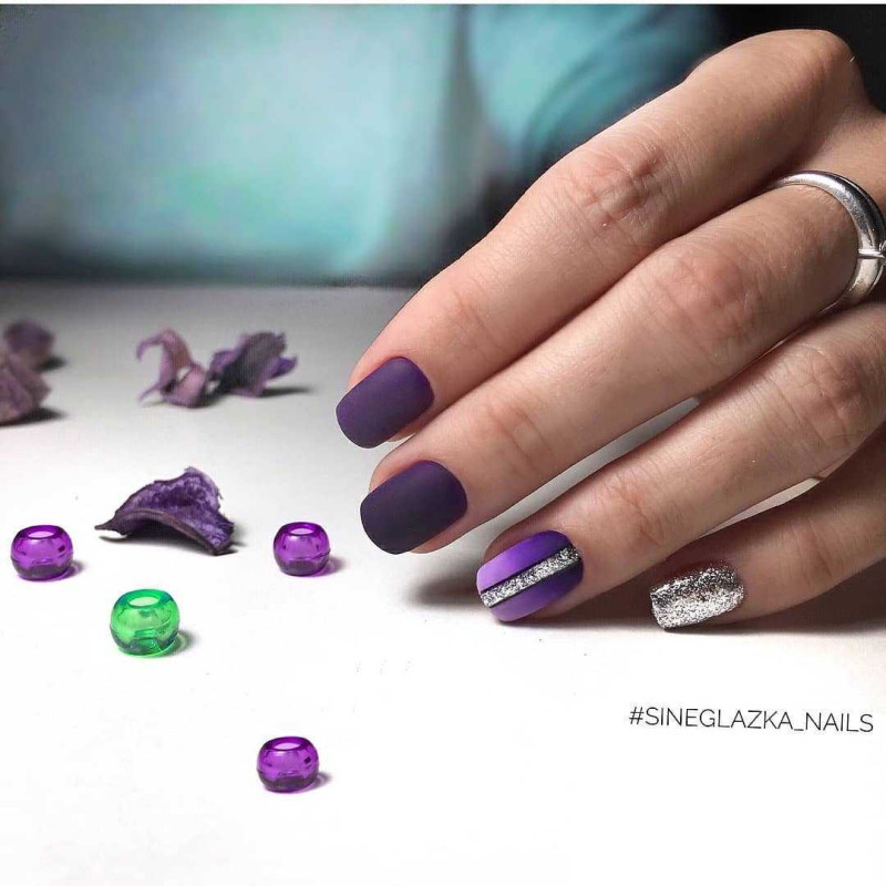 Матовые фиолетовые ногти сейчас на пике популярности. Невзирая на то, что фиолетовый и сам по себе достаточно глубокий, интересный и насыщенный цвет, под слоем матового топа он смотрится еще более привлекательно и оригинально. Для wow-эффекта чередуйте глянцевые и матовые элементы.