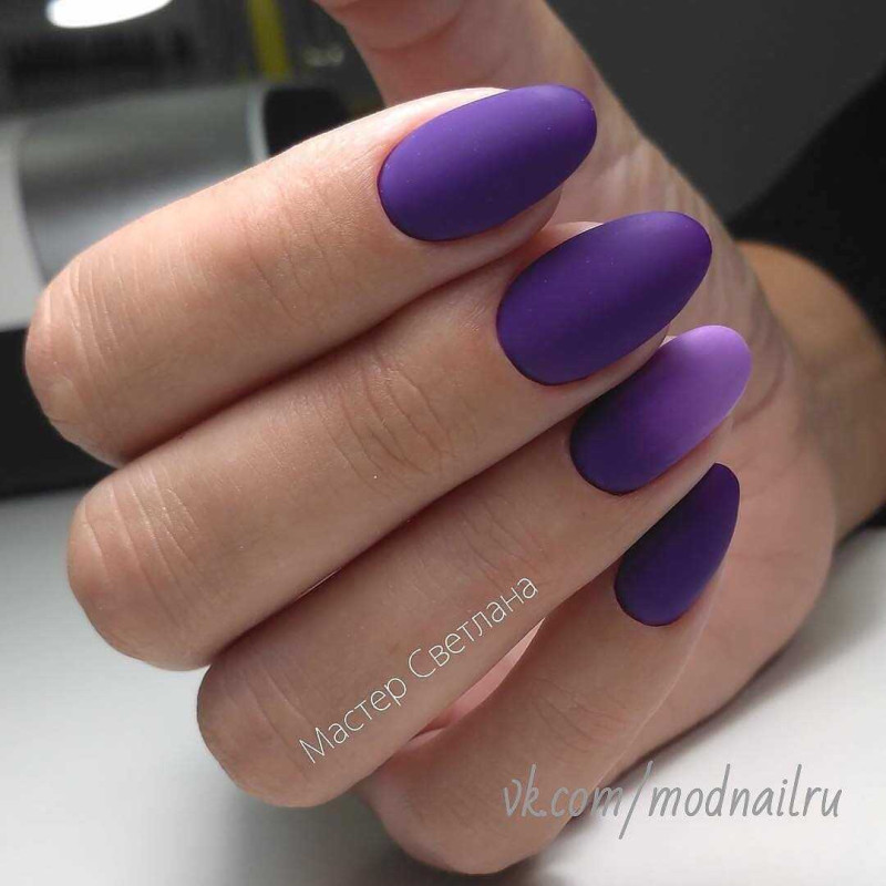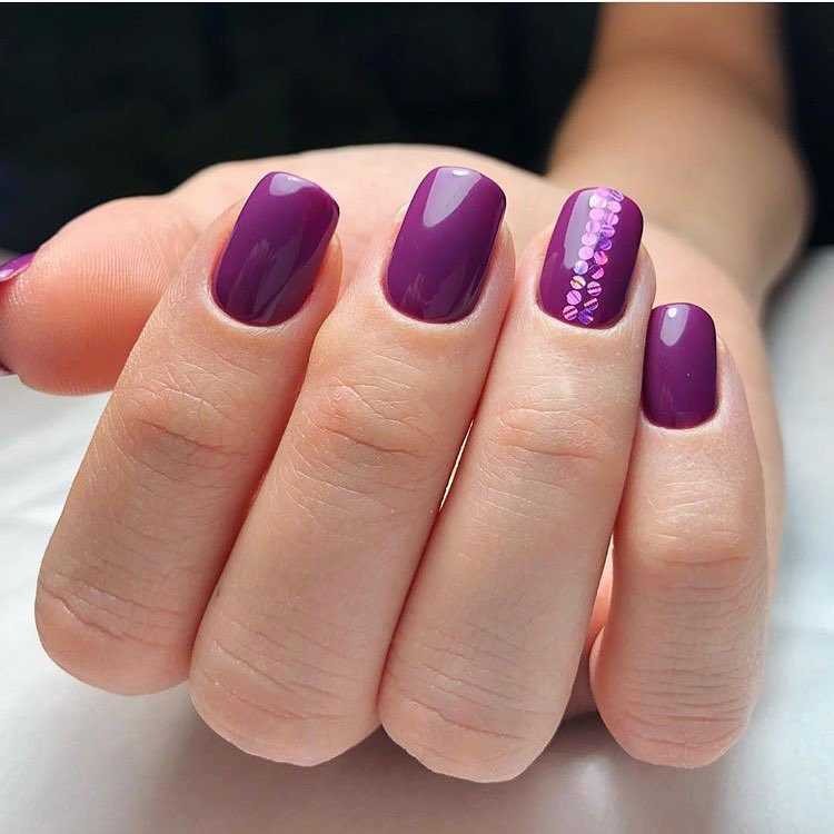 Фиолетовый — сложный цвет и даже однотонный маникюр, выполненный в его оттенках, не будет выглядеть слишком консервативно. Такая расцветка подойдет тем, кто хочет выделяться, но при этом не тратить много времени на выбор дизайна ногтей. А в качестве декора можно поэкспериментировать с комбинацией разных фактур.