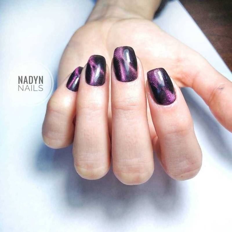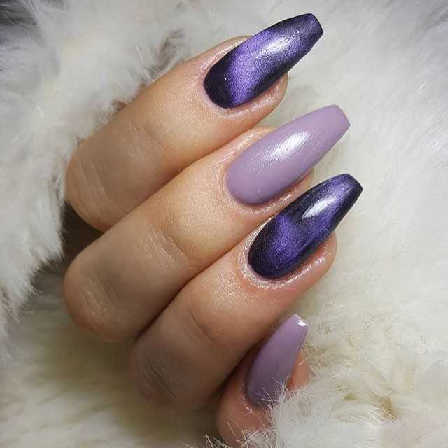 Миндалевидная форма ноготков — классика. Здесь уместны все оттенки сиреневого: от максимально светлых до темных, практически черных. На миндальной форме эффектно смотрится маникюр “кошачий глаз”, вертикальное омбре, необычный френч.