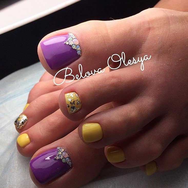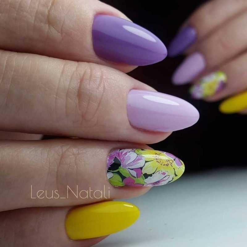 В примере сочетания солнечного жёлтого и сиреневого предпочтительно выбирать из оттенков пастельной палитры, что позволит немного сгладить яркость первого и подчеркнёт нежность второго из используемых тонов. Нанесите жёлтый на пару ноготков и дополните основание бусинами, мелкими стразами, узорами в стиле «перепелиных яиц» или «брызги красками». Ваши ручки с таким маникюром не останутся без внимания.
