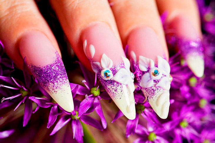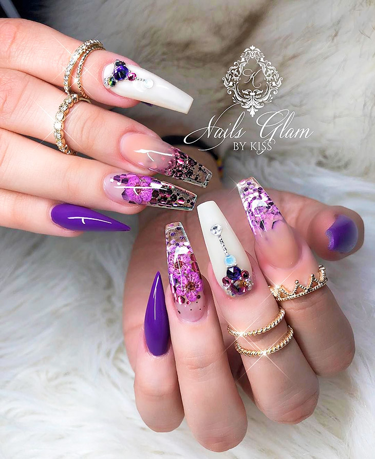 Давайте разберемся, какими дизайнами можно украсить лиловый маникюр на длинных ногтях.
