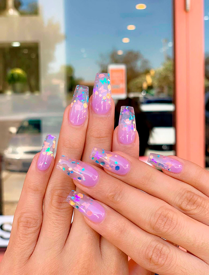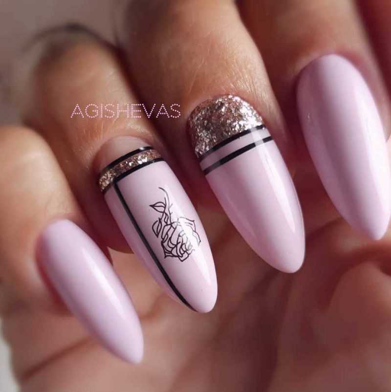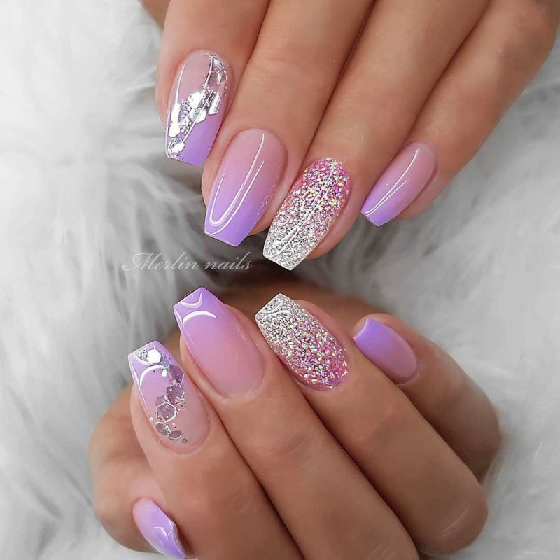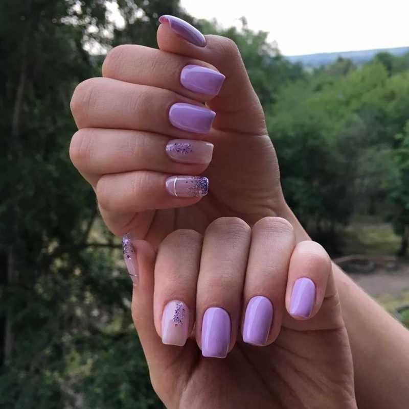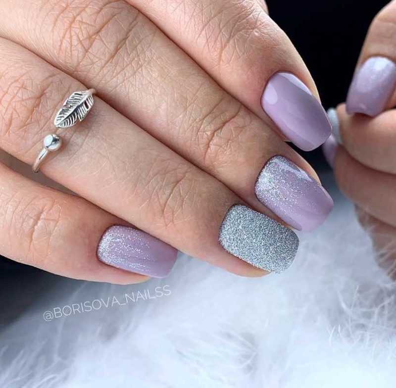 Очень элегантный дизайн ногтей, в котором глиттер сочетается с сиреневым гель-лаком. Таким образом, они не привлекают к себе и дизайну слишком много внимания. Также используйте более яркие акценты: серебряные, золотые, розовые блестки и другие блестящие украшения.