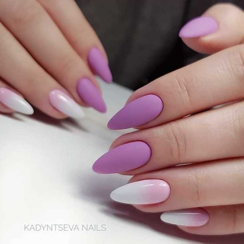 Комбинировать светло-бежевые тона и насыщенный сливовый цвет не всегда удобно. Маникюр омбре – идеальная база, чтобы сочетать фиолетовый с белым. Растяжка цвета идет от белой основы, переходя в несколько тонов светло-фиолетового, и заканчивается интенсивным аметистовым тоном.