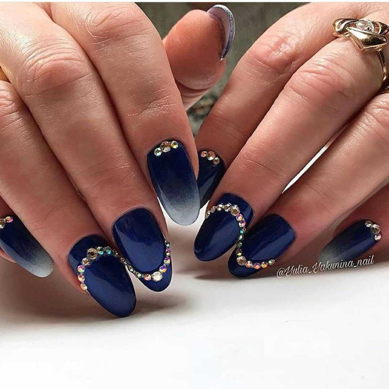 Их часто располагают около кутикулы формой, повторяющей изгиб, либо треугольником. Можно внести нотку разнообразия и разместить стразы в единичном порядке или геометричными полосками.
