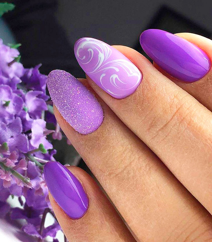 Неил-арт — вариант для «продвинутых пользователей», которые могут самостоятельно нарисовать на своих ноготках настоящий шедевр изобразительного искусства. Если вы не относитесь к их числу, не стоит отчаиваться — просто обратитесь за помощью к любимому мастеру в салоне. Украшая фиолетовый лак ажурным узором из белых цветов можно получить свадебный маникюр, а добавив туда несколько ровных штрихов — геометрический маникюр с этно-мотивами.