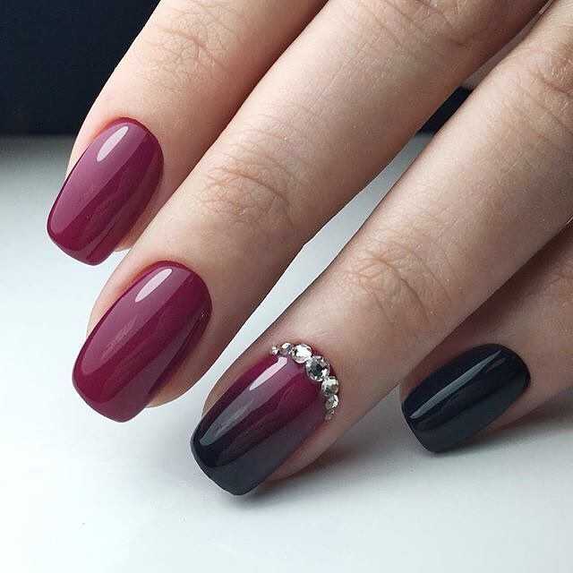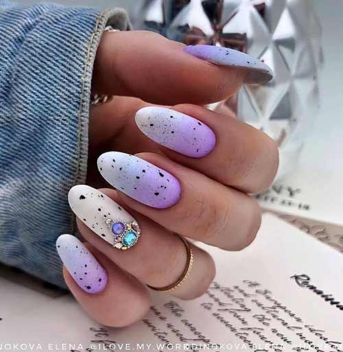 Кроме комбинации белого цвета с фиолетовыми переливами, актуальны варианты в темном цвете. Лунки окрашиваются в самый светлый тон из фиолетовой палитры, приемлемый в каждой конкретной ситуации. Затем каждый новый тон становится все темнее и темнее. Кончики ногтей окрашивают в угольно-черный цвет. Такой же нейл-арт можно попробовать сделать в матовой фактуре. Однако в таком случае, лучше, чтобы ногтевые пластинки были предельно удлиненными.