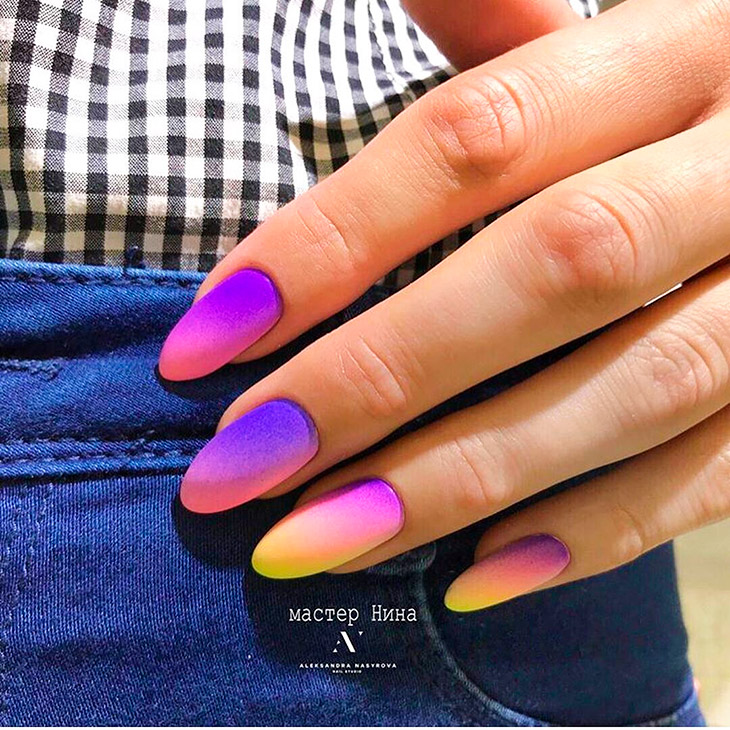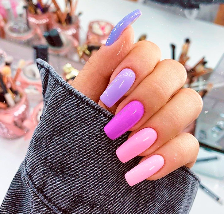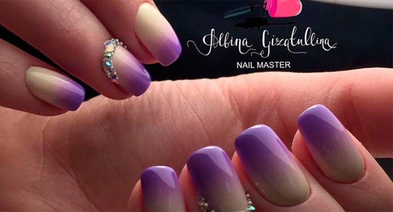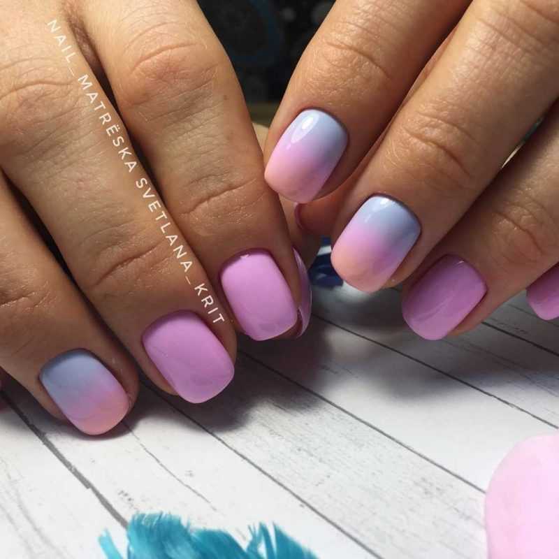 Омбре оживает с добавлением лилового цвета. Градиент представляет собой плавный переход между сочетающимися оттенками. Вопреки частому мнению использовать в омбре можно не только смежные соседние цвета, но и противоположные контрастные.