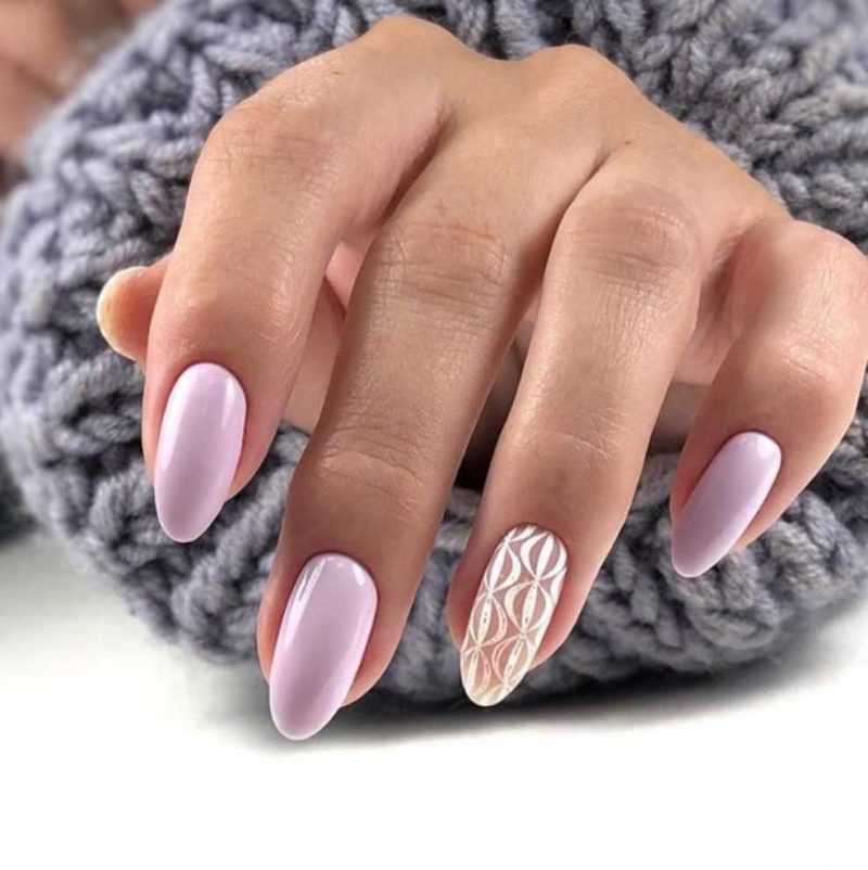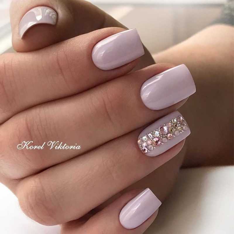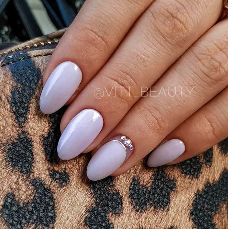 Это предложение станет идеальным выбором для тех, кто ещё не раскрыл для себя особенности сиреневого оттенка или считает однотонное покрытие слишком «приторным». Покройте нейтральным белым несколько ногтевых пластин и дополните их парой блестящих кристаллов или модными слайдерами. Таким образом вы измените используемую ранее концепцию и освежите ноготки.