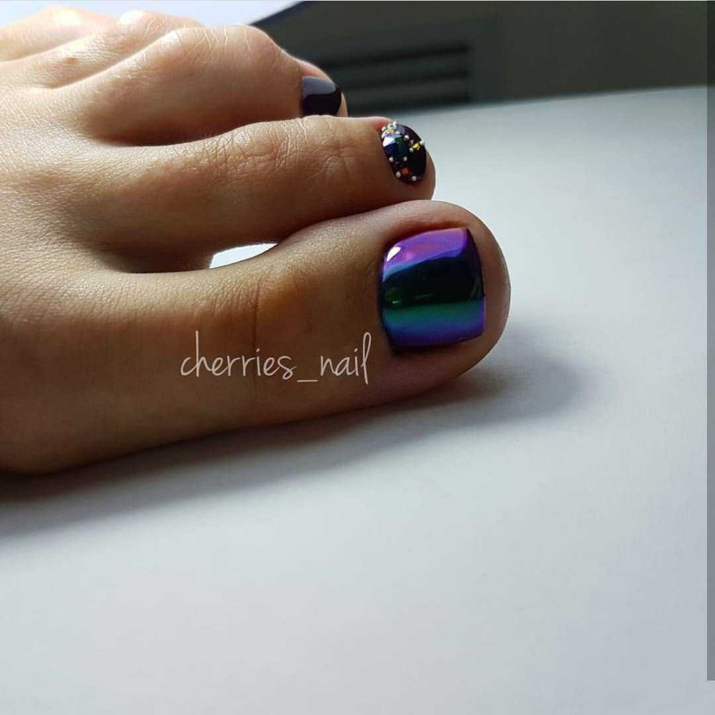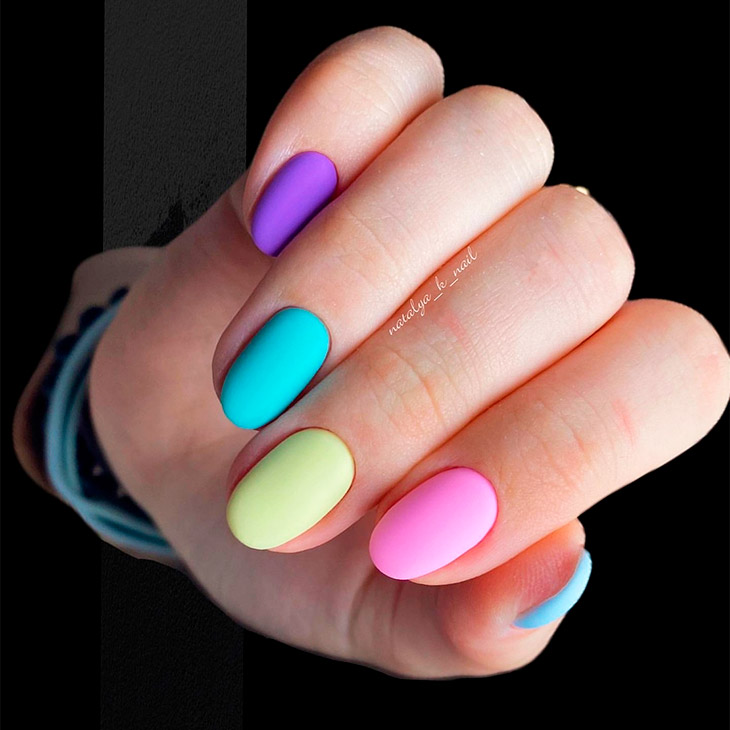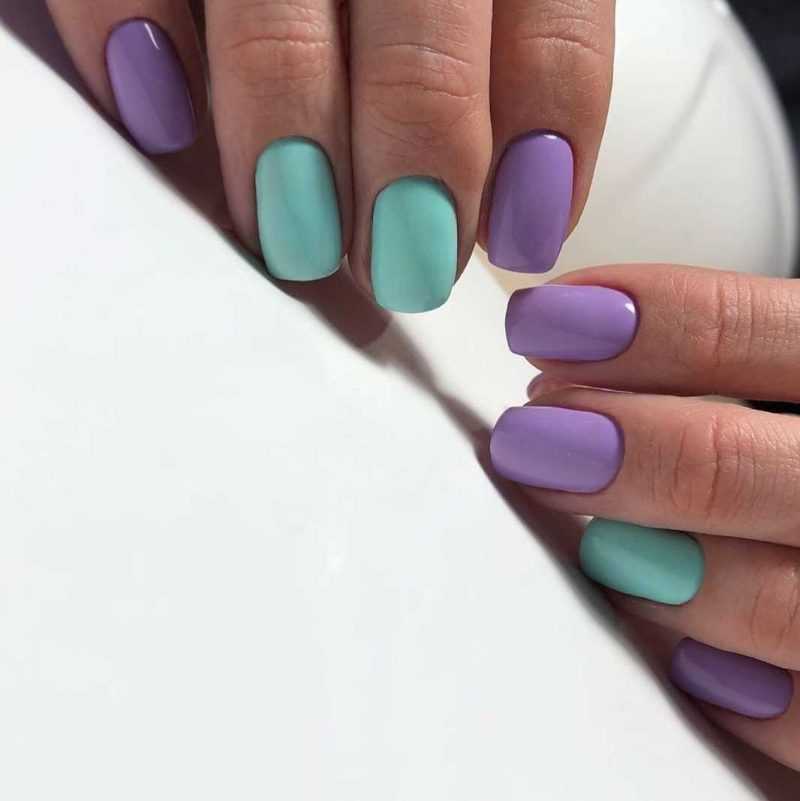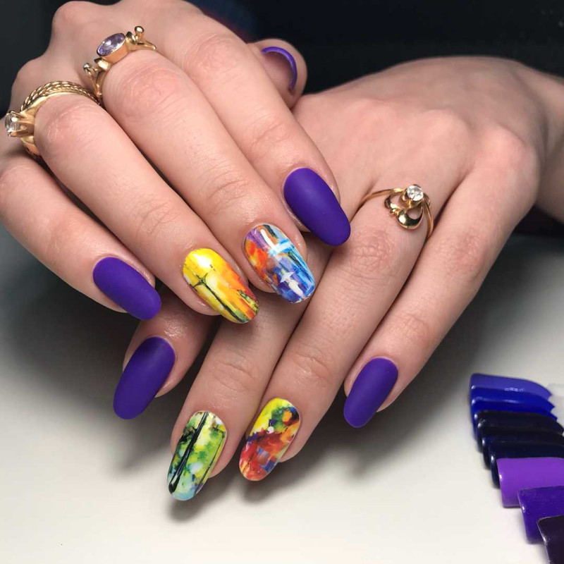 Разноцветный фиолетовый маникюр — выбор креативных особ, которые не боятся выделиться из толпы. В одном дизайне можно сочетать как разные оттенки, так и любые комплементарные ему цвета: розовые, синие, зеленые и желтые. Чем ярче — тем лучше.