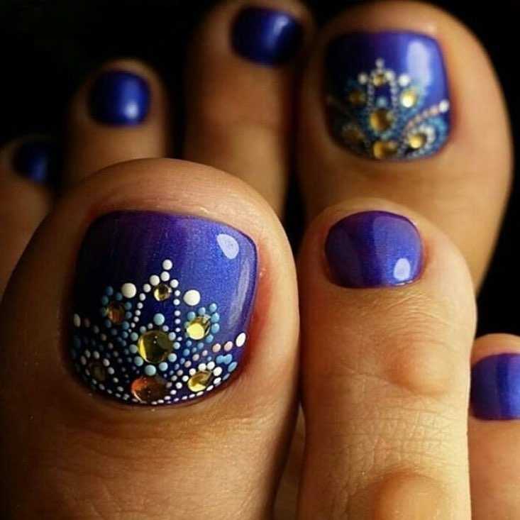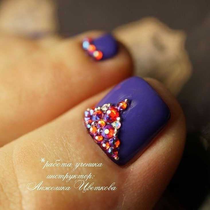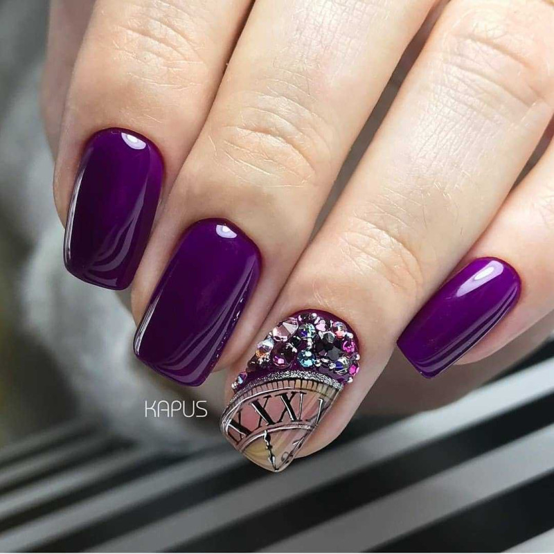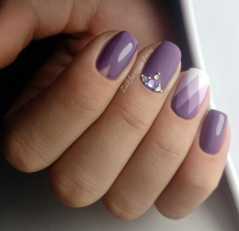 Для коротких ноготков актуальнее будут стразы поменьше, чтоб не испортить общую картину излишней массивностью. Необычно и модно выглядит комбинация матового «финиша» и камней на фиолетовом фоне. Можно подчеркнуть сверкающими узорами форму ногтевых пластин. В любом из вариантов дуэт фиолетовых оттенков и страз – просто великолепен
