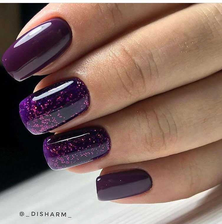 Фиолетовый маникюр с блестками — яркий вариант для смелых леди, любящих быть в центре внимания. Более того, подобный декор характеризует не только повседневный, но и новогодний маникюр. Достаточно просто нанести небольшое количество праздничного глиттера на свободный край ногтевой пластины и создать иллюзию ноготков, припорошенных снегом. Magic happens!