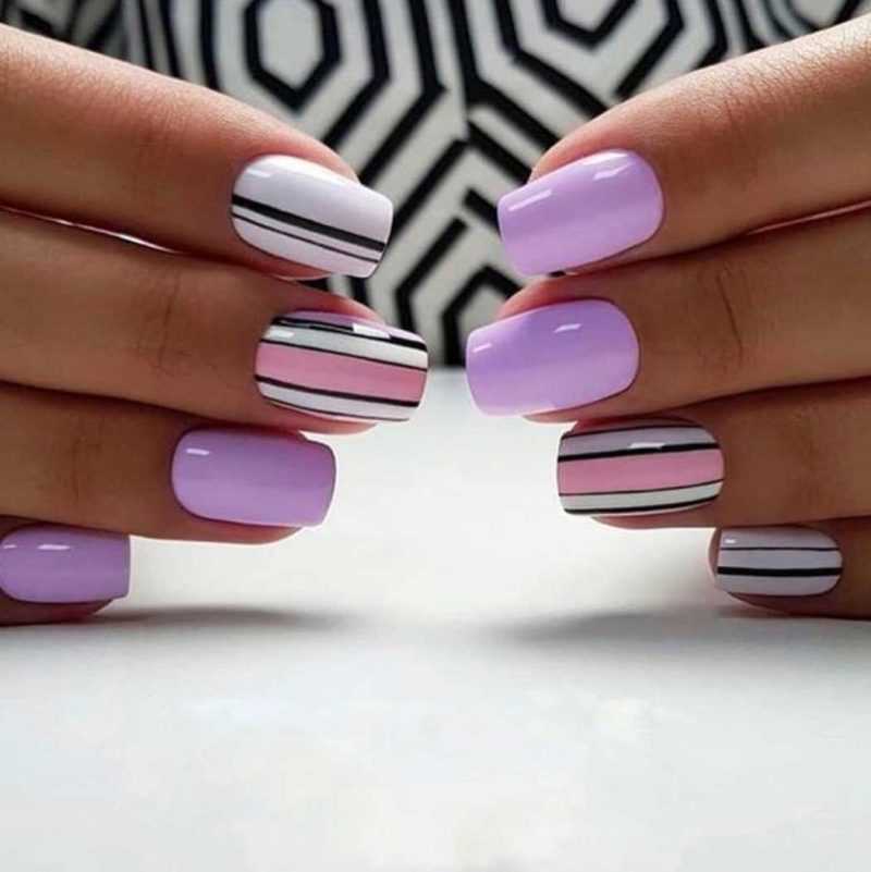 Маникюр с геометрическими рисунками всегда смотрится необычно, свежо и привлекательно, поэтому в 2021 году дизайнеры не оставили в стороне идею совместить на ноготках многогранный сиреневый лак и геометрические мотивы. Всевозможные фигуры и полоски могут иметь вид графического рисунка, наноситься на основание в хаотичном порядке или представлять собой сложные композиции – вариаций множество. При этом можно дополнительно использовать фольгу в качестве подложки, перламутровую втирку либо прорисовывать детали при помощи жидкого глиттера.
