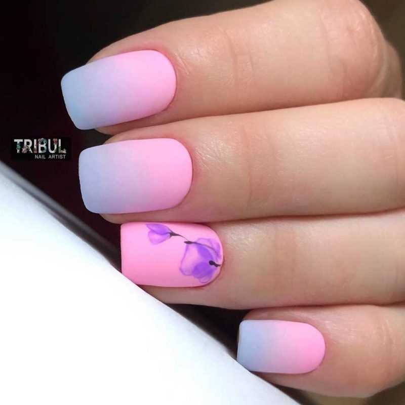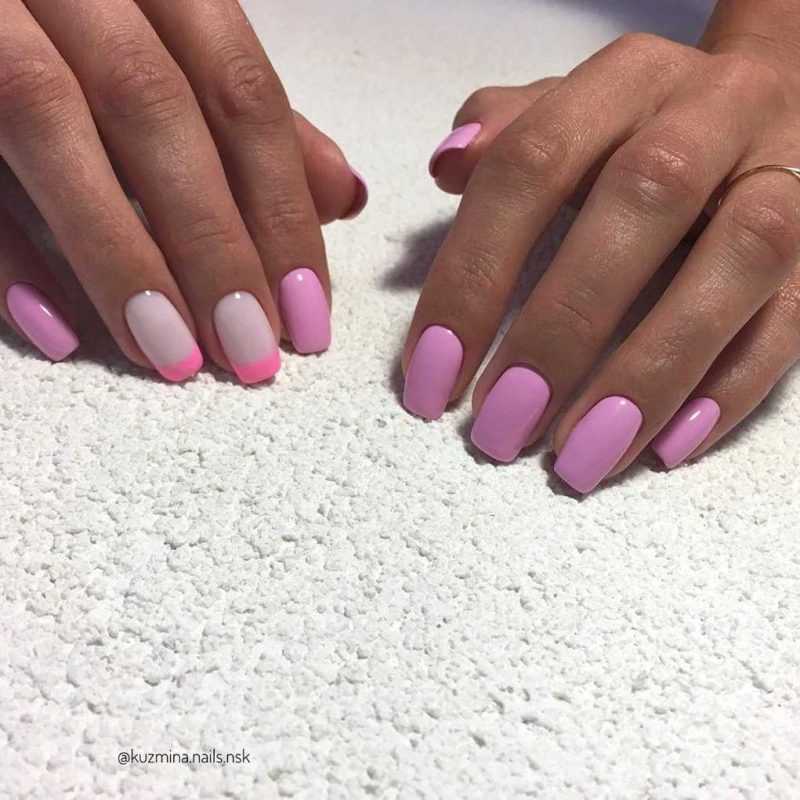 Подобное сочетание можно уверенно назвать одним из самых распространённых. При этом не стоит думать, что популярность означает обыденность. Наоборот, тандем розового и сиреневого предоставляет модницам множество идей маникюра и всегда смотрится свежо. Среди актуальных предложений удивительные переходы в стиле градиент, которые можно создавать не только на каждой ногтевой пластине, но и от ноготка к ноготку, использование акриловой пудры с характерным оттенком и абстрактные изображения. Весьма эффектно смотрится в розово-сиреневом исполнении комбинирование однотонного нейл-арта с элементами «негативного пространства» и многие другие идеи.