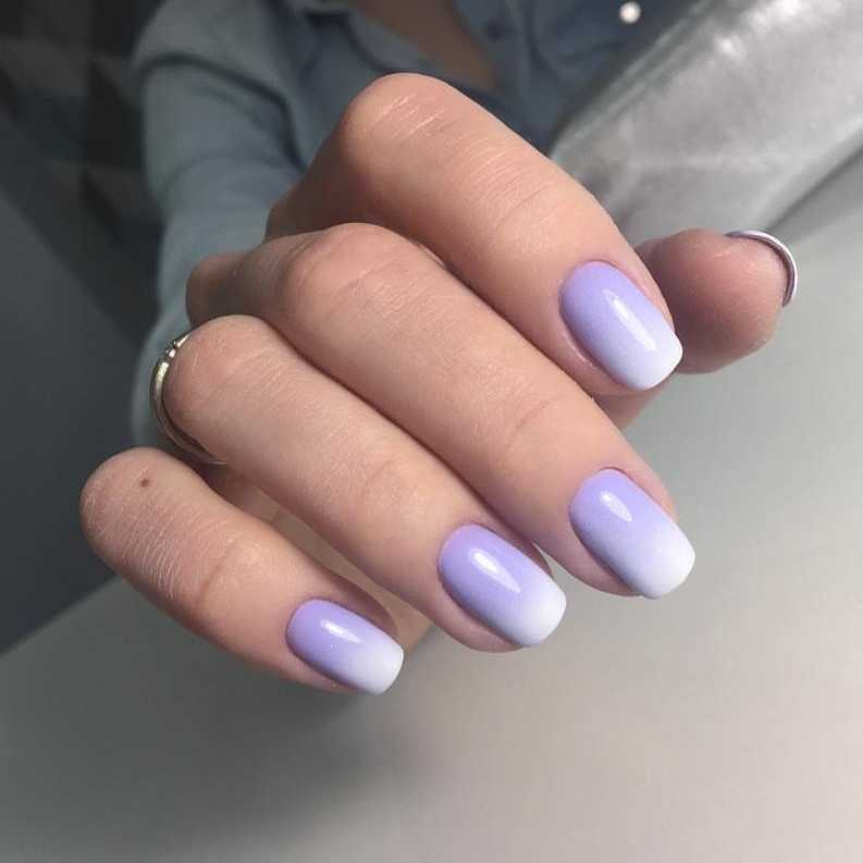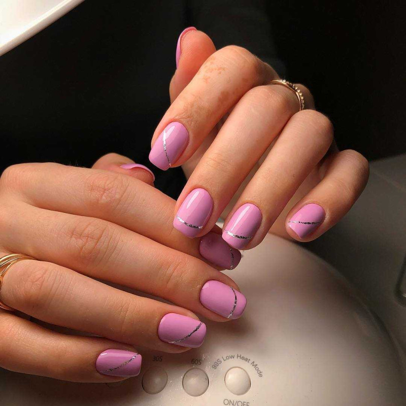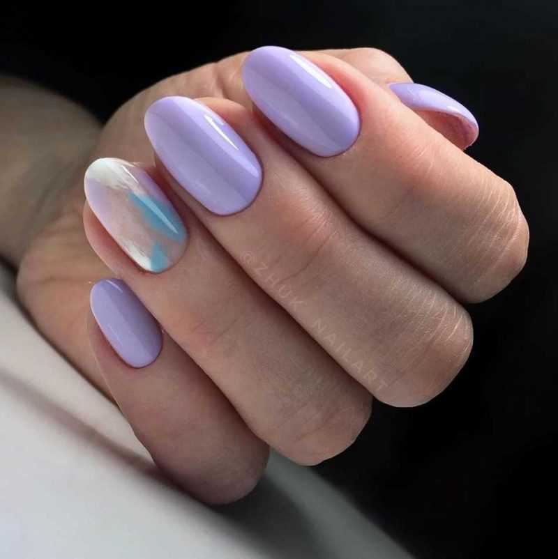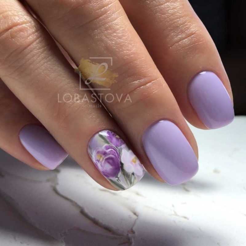 Для короткой длины отлично подойдут оттенки средней интенсивности. Они визуально удлиняют ноготь, поэтому можно будет обойтись без наращивания. Оптимальный дизайн сиреневого маникюра для коротких ноготках — матовое покрытие иди градиент. А вот от яркого глиттера или фольги в дизайне лучше отказаться.
