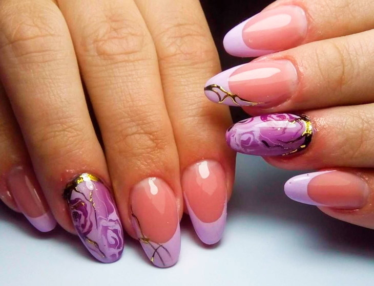 Лиловым цветом можно нарисовать французский маникюр. Он смотрится очень женственно и утонченно. В качестве акцентов используйте блестки или смежные цвета. К примеру, лиловый френч хорошо гармонирует с белым и розовым.