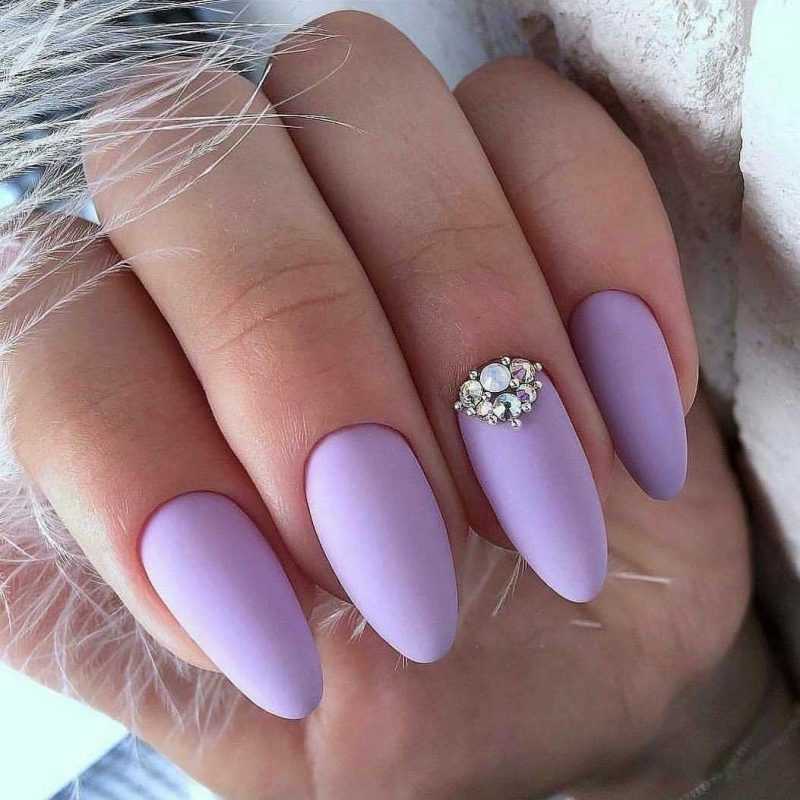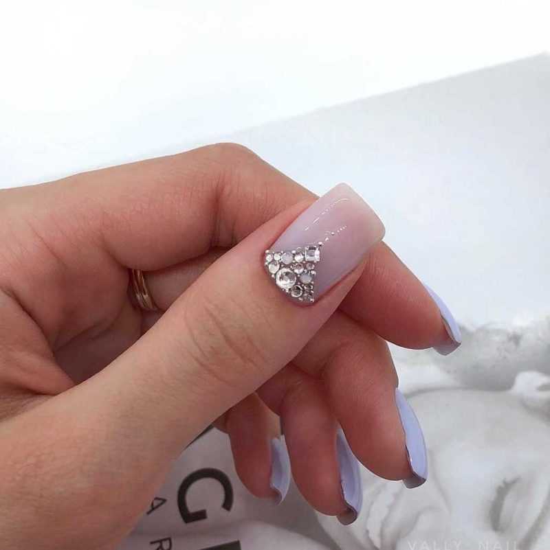 Стразы на лиловом цвете добавят игривости и кокетства образу. Их можно носить в повседневной жизни, а можно выполнить специально к мероприятию. Также стразы прекрасно дополнят матовые ноготки. Нужно просто вместо глянцевого топа, обвести их матовым и закрепить привычным способом.