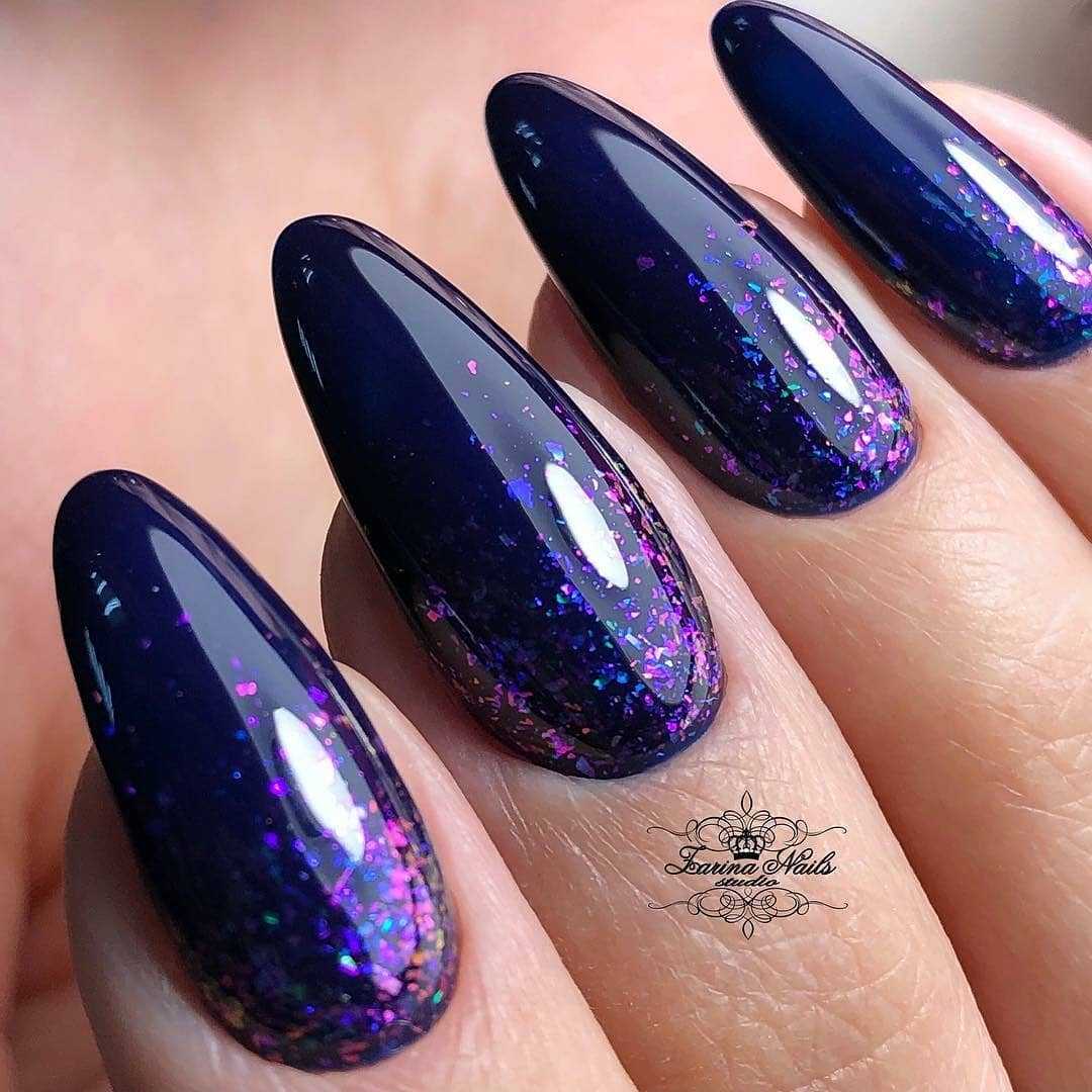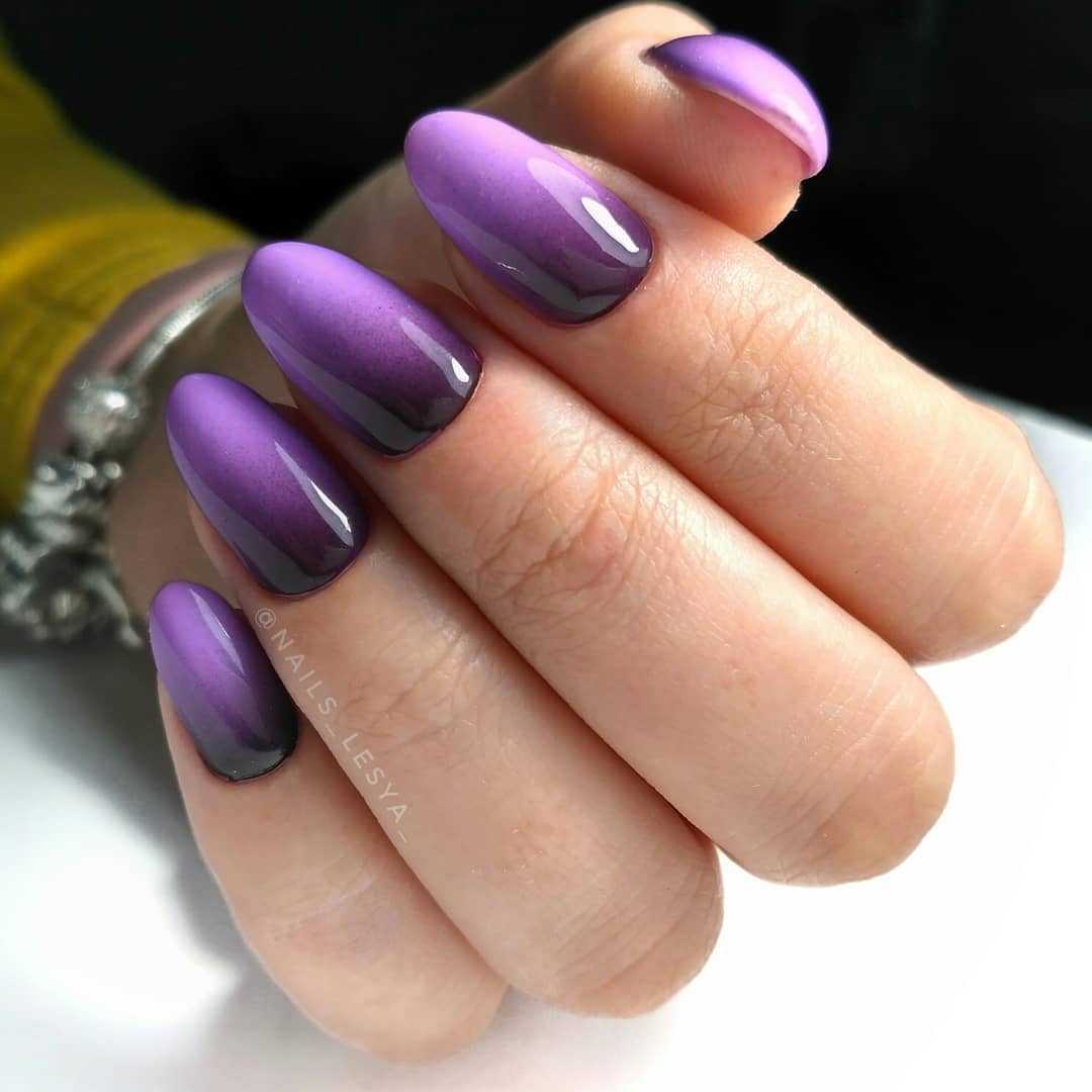 Кроме комбинации белого цвета с фиолетовыми переливами, актуальны варианты в темном цвете. Лунки окрашиваются в самый светлый тон из фиолетовой палитры, приемлемый в каждой конкретной ситуации. Затем каждый новый тон становится все темнее и темнее. Кончики ногтей окрашивают в угольно-черный цвет. Такой же нейл-арт можно попробовать сделать в матовой фактуре. Однако в таком случае, лучше, чтобы ногтевые пластинки были предельно удлиненными.