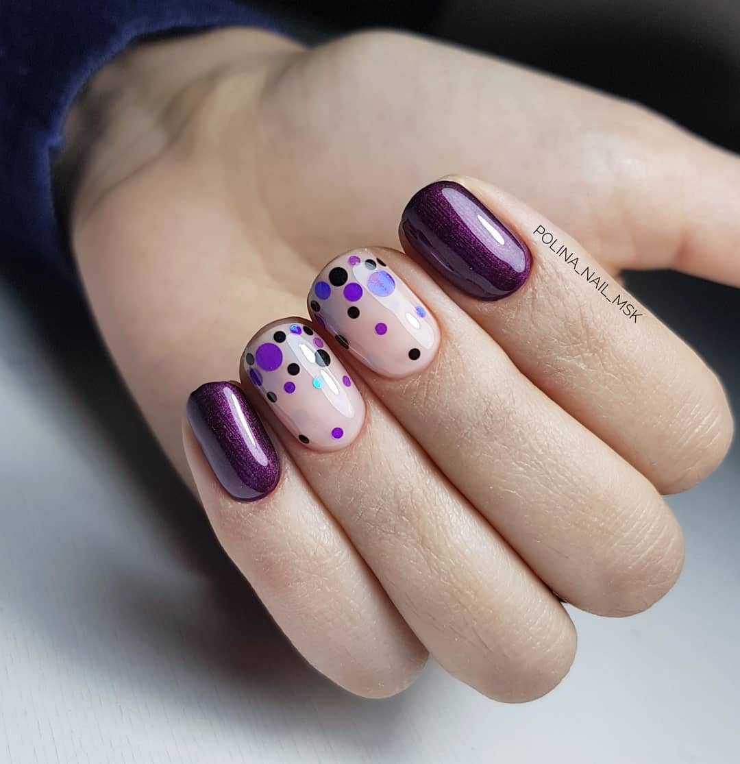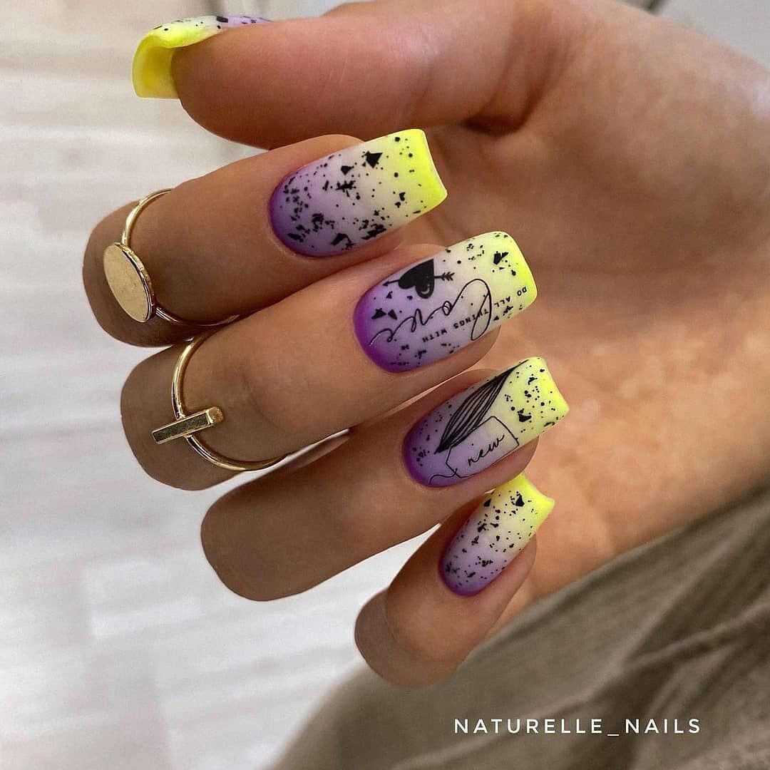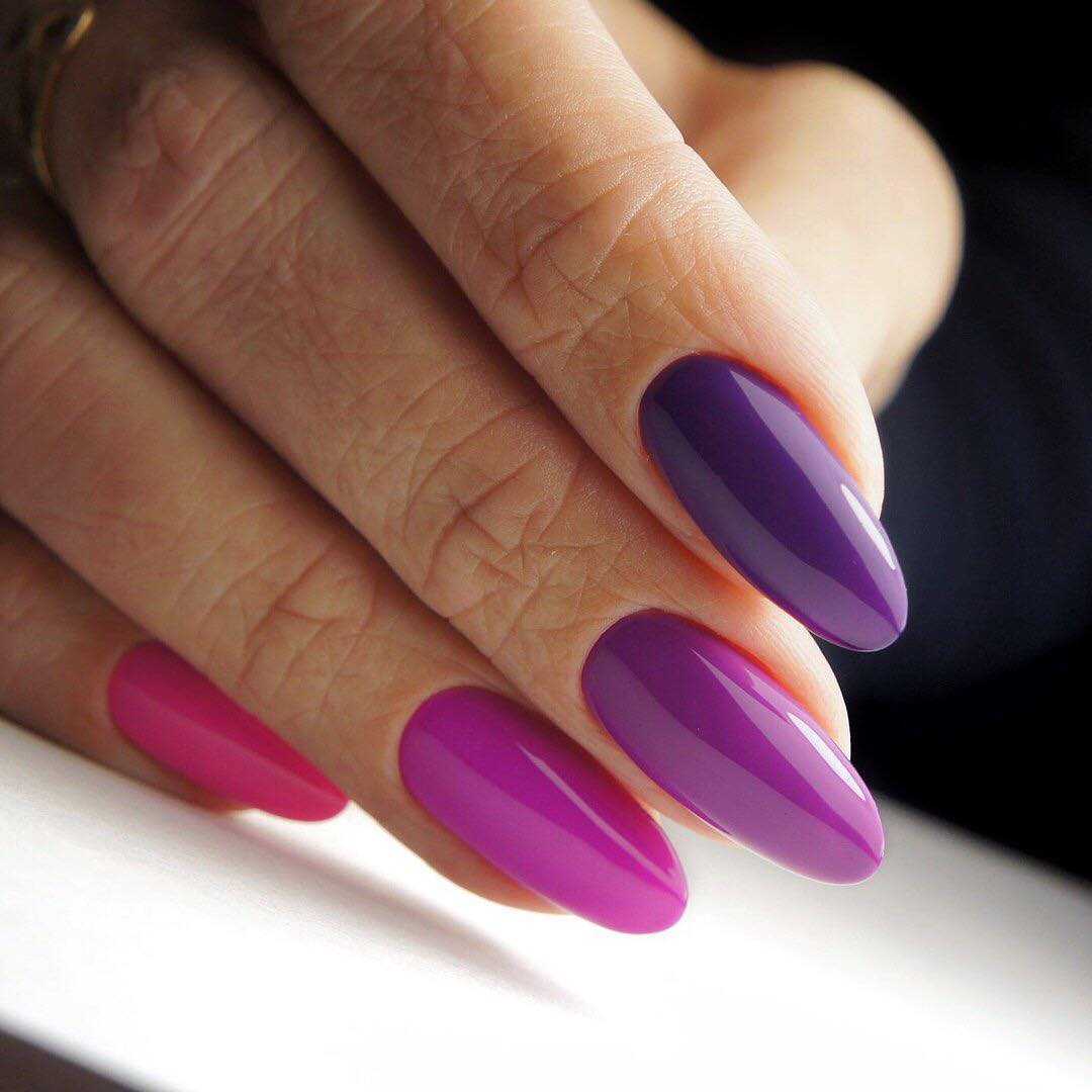 Разноцветный фиолетовый маникюр — выбор креативных особ, которые не боятся выделиться из толпы. В одном дизайне можно сочетать как разные оттенки, так и любые комплементарные ему цвета: розовые, синие, зеленые и желтые. Чем ярче — тем лучше.