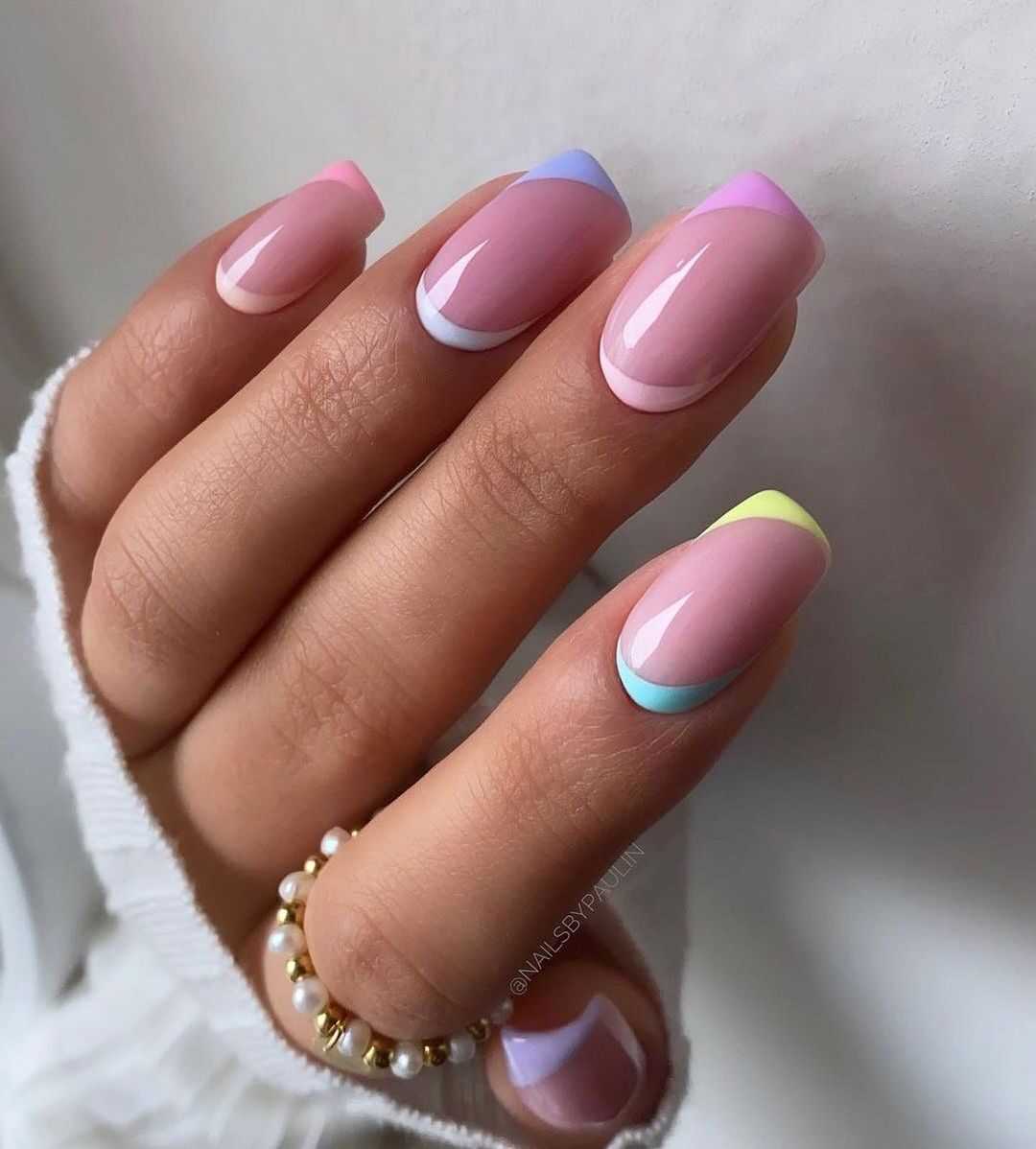 Можно выполнить градиент горизонтально или вертикально. Ярко или приглушённо. Все зависит только от вашей фантазии и настроения. К примеру, для сочного эффекта понадобится ярко-зеленый и голубой. Для более мягкого используйте белый, а соседние ногти покройте одним цветом и матовым топом.