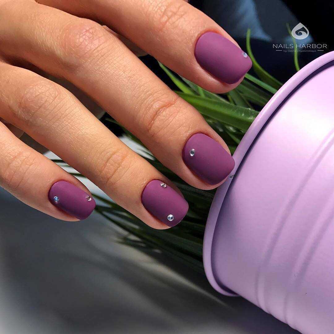 Стразы на лиловом цвете добавят игривости и кокетства образу. Их можно носить в повседневной жизни, а можно выполнить специально к мероприятию. Также стразы прекрасно дополнят матовые ноготки. Нужно просто вместо глянцевого топа, обвести их матовым и закрепить привычным способом.