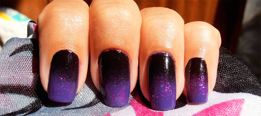 Омбре оживает с добавлением лилового цвета. Градиент представляет собой плавный переход между сочетающимися оттенками. Вопреки частому мнению использовать в омбре можно не только смежные соседние цвета, но и противоположные контрастные.