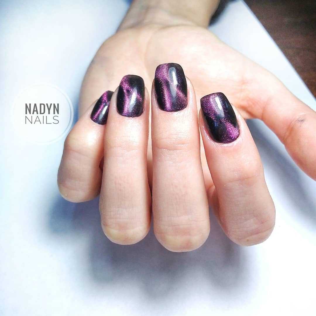 Миндалевидная форма ноготков — классика. Здесь уместны все оттенки сиреневого: от максимально светлых до темных, практически черных. На миндальной форме эффектно смотрится маникюр “кошачий глаз”, вертикальное омбре, необычный френч.