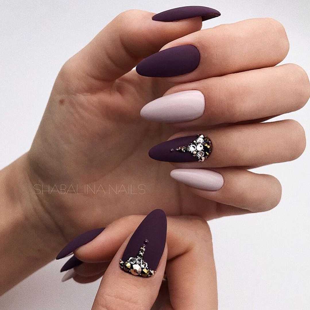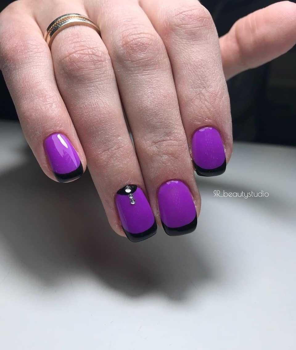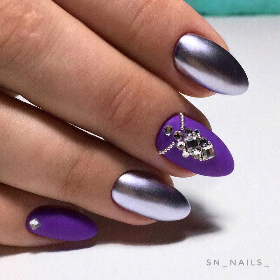 Для коротких ноготков актуальнее будут стразы поменьше, чтоб не испортить общую картину излишней массивностью. Необычно и модно выглядит комбинация матового «финиша» и камней на фиолетовом фоне. Можно подчеркнуть сверкающими узорами форму ногтевых пластин. В любом из вариантов дуэт фиолетовых оттенков и страз – просто великолепен