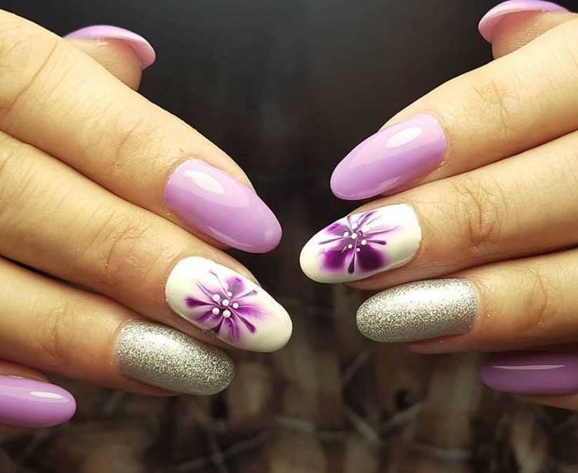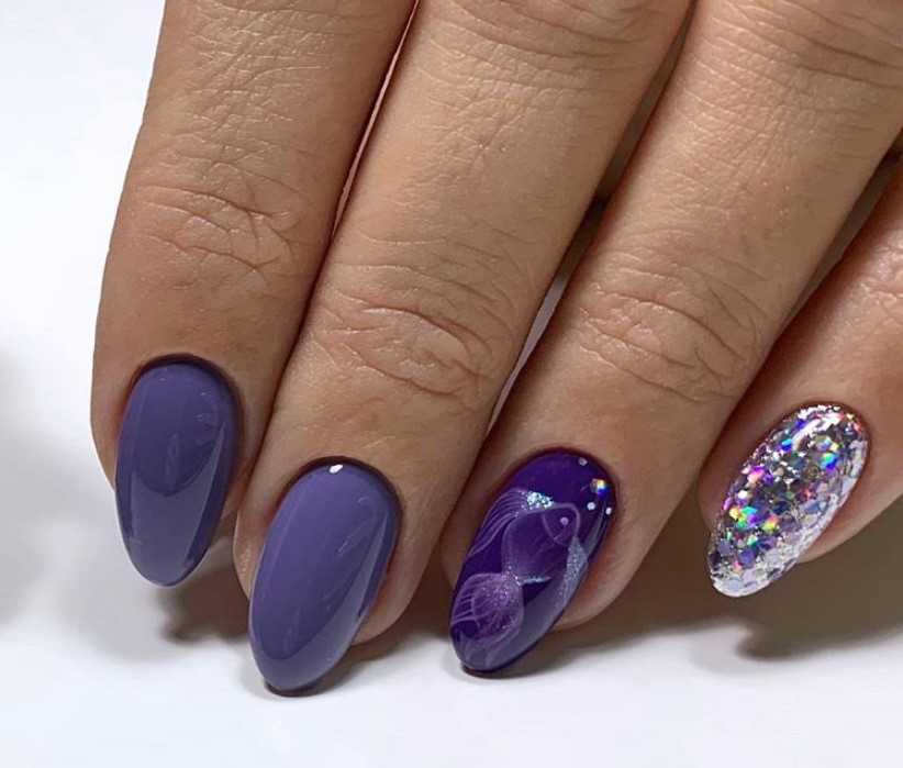 Очень элегантный дизайн ногтей, в котором глиттер сочетается с сиреневым гель-лаком. Таким образом, они не привлекают к себе и дизайну слишком много внимания. Также используйте более яркие акценты: серебряные, золотые, розовые блестки и другие блестящие украшения.