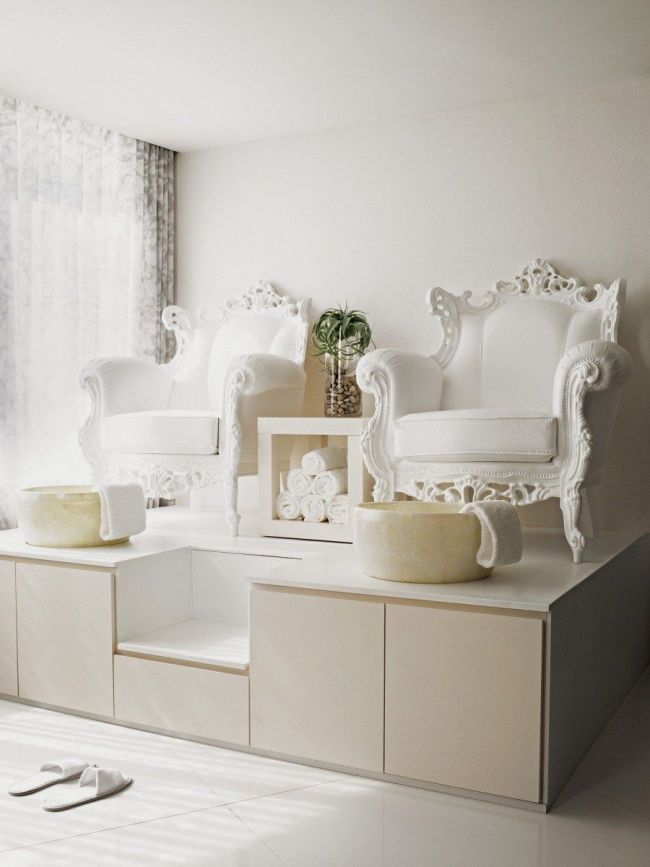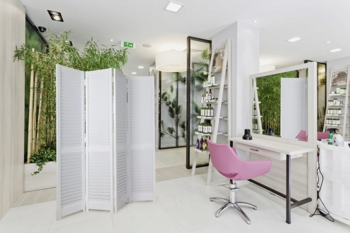 Если хозяин помещения не против, можно отгородить свое рабочее место ширмой. Этот прием создаст атмосферу приватности, что позволит клиентам чувствовать себя более расслабленно. Рекомендуемый цвет экрана — белый. Во-первых, такие поверхности отражают свет, что пойдет только на пользу рабочему процессу. Во-вторых, белый цвет ассоциируется с чистотой и гигиеной, что создает ощущение спокойствия. Именно поэтому многие владельцы салонов красоты и салонов красоты выбирают для оформления светлую мебель и украшения.