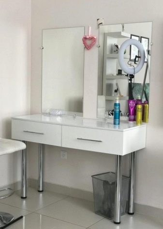 Столик, на котором будут располагаться инструменты для работы – еще один обязательный элемент. Можно дополнить его небольшим шкафчиком, если приспособлений много. Ну и, конечно, не обойтись без зеркала среднего размера, в котором клиент сможет хорошо рассмотреть результат вашей работы.