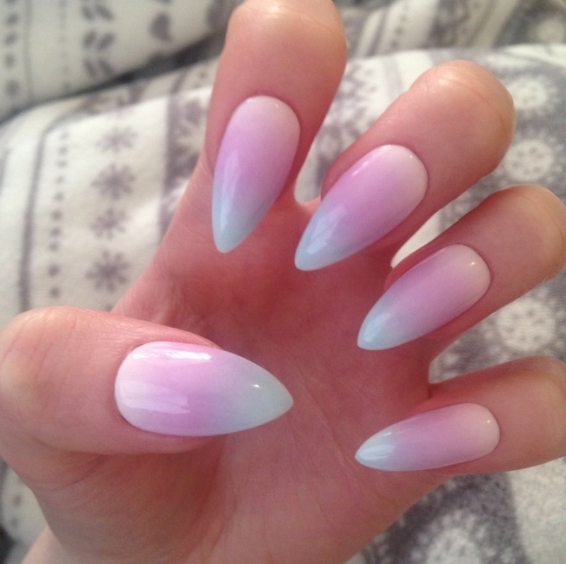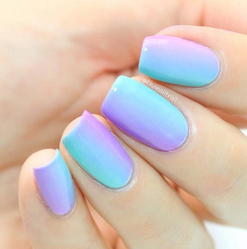 Голубой. Нежный небесный омбре идеально подходит для ногтей средней длины. В качестве добавочного тона можно использовать белый, бежевый, сиреневый, фиолетовый, розовый.