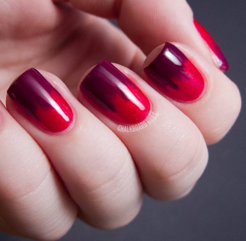 Красный лак — яркий и страстный. Если хочется немного разнообразить дизайн — сделайте градиентный маникюр в красных тонах. Начать можно с розового, а закончить фуксией. Другой вариант — растяжка от красного к черному или наоборот.